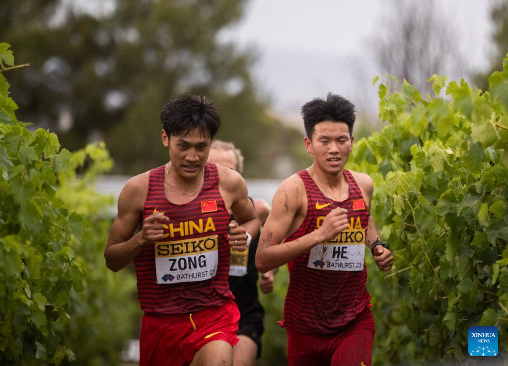 Zong Qinghua (L) and He Yingbing of China compete during the men's 10km race at the World Athletics Cross Country Championships Bathurst 23 in Bathurst, New South Wales, Australia, on Feb. 18, 2023. (Photo by Hu Jingchen/Xinhua)