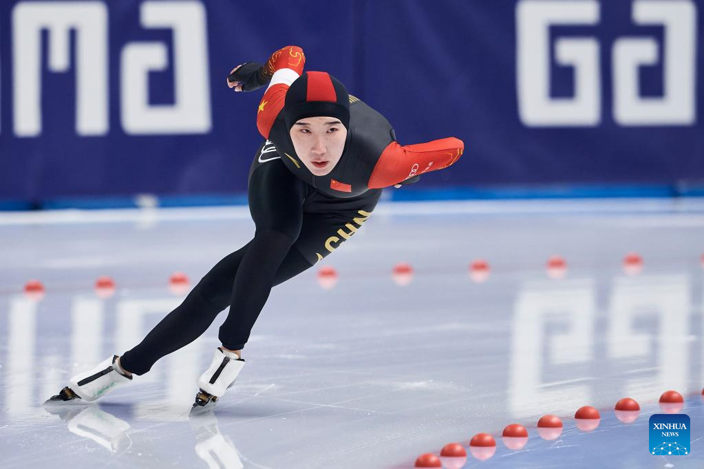 Han Mei of China competes in 1500m Women Division A race at the ISU Speed Skating World Cup in Tomaszow Mazowiecki, Poland, Feb. 18, 2023. (Photo by Rafal Oleksiewicz/Xinhua)