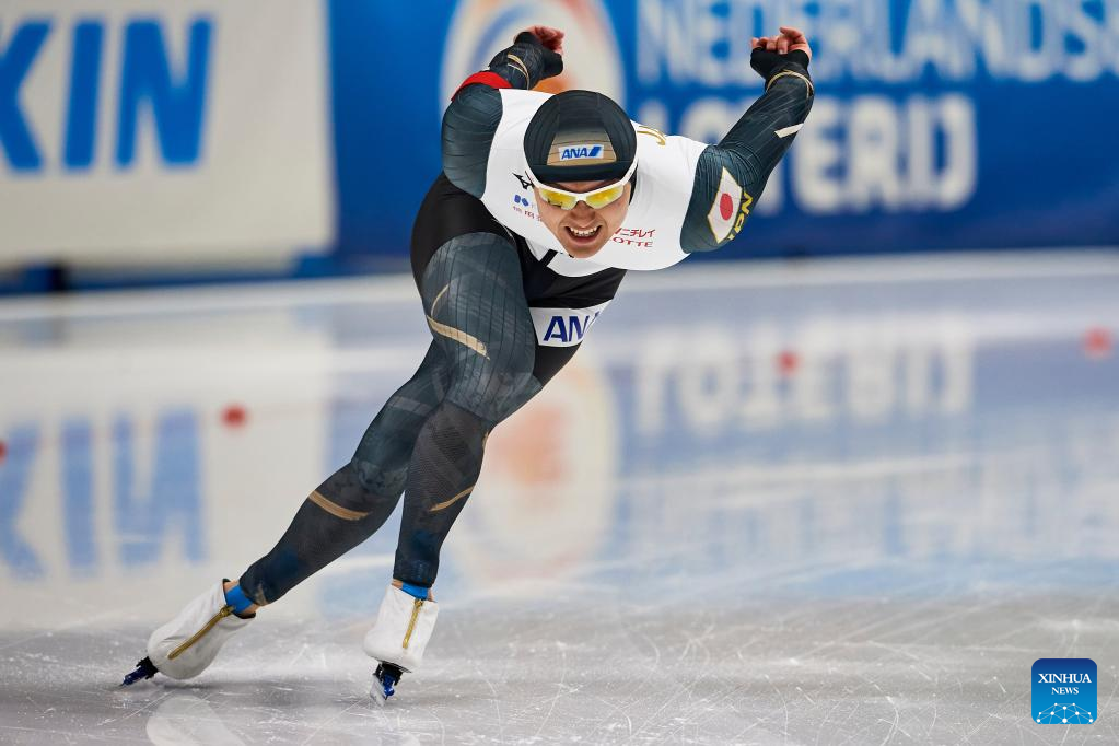 Murakami Yuma of Japan competes in 500m Men Division A race at the ISU Speed Skating World Cup in Tomaszow Mazowiecki, Poland, Feb. 18, 2023. (Photo by Rafal Oleksiewicz/Xinhua)