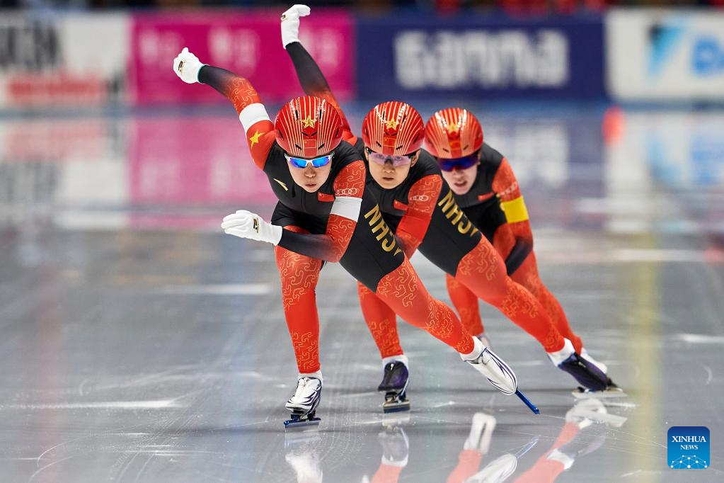 (from L to R) Zhang Lina, Jin Jingzhu and Han Mei of China compete in Team Sprint Women Division A race at the ISU Speed Skating World Cup in Tomaszow Mazowiecki, Poland, Feb. 18, 2023. (Photo by Rafal Oleksiewicz/Xinhua)