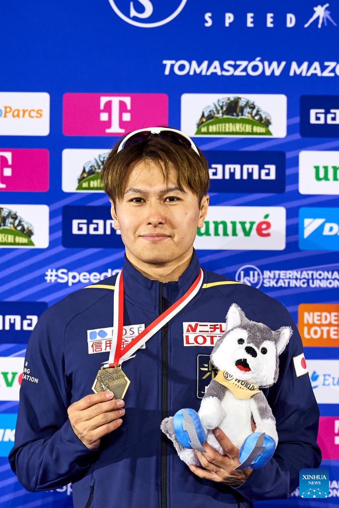 Murakami Yuma of Japan celebrates during the awarding ceremony after 500m Men Division A race at the ISU Speed Skating World Cup in Tomaszow Mazowiecki, Poland, Feb. 18, 2023. (Photo by Rafal Oleksiewicz/Xinhua)