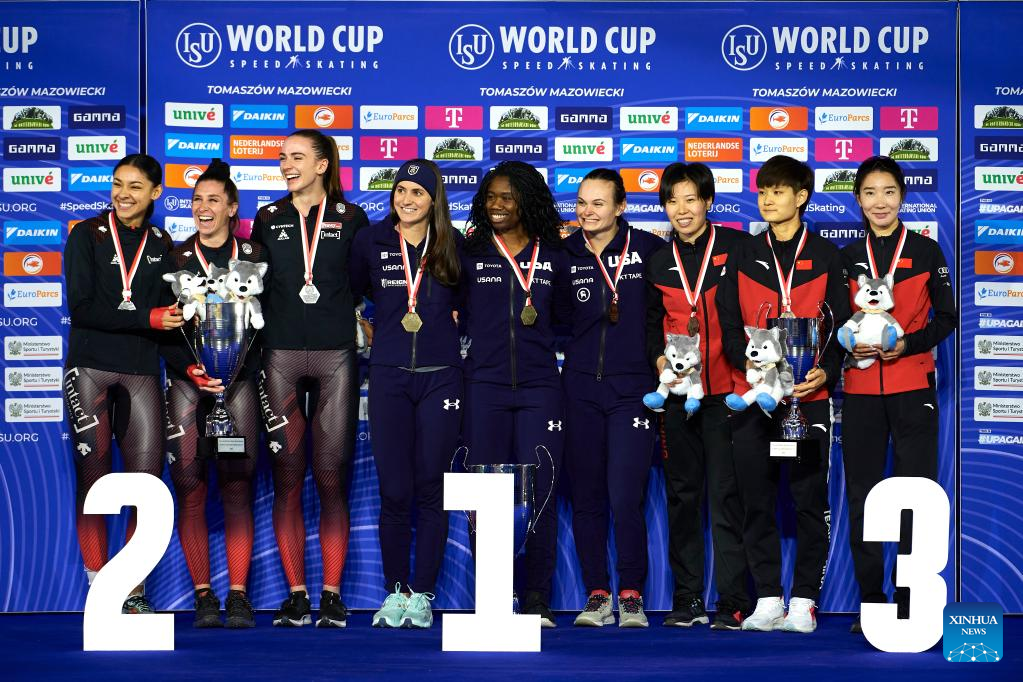 WARSAW, Feb. 18 (Xinhua) -- The United States won the women's team sprint at the ISU Speed Skating World Cup followed by Canada and China in Tomaszow Mazowiecki, Poland on Saturday.