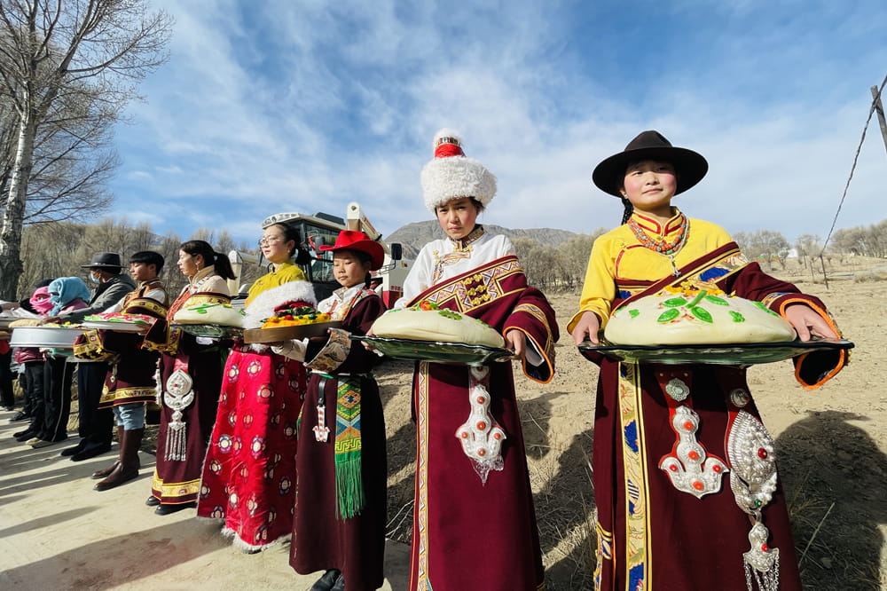 Farmers in traditional costumes hold steamed buns to celebrate the start of spring farming in Guide county, Tibetan Autonomous Prefecture of Hainan, northwest China’s Qinghai Province. (Photo/Publicity Department of CPC Hainan Tibetan Autonomous Prefecture Committee)