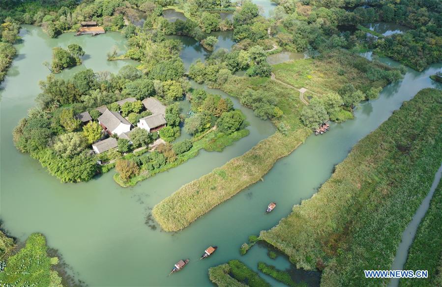 Aerial photo taken on Oct. 8, 2020 shows sightseeing boats in Xixi National Wetland Park in Hangzhou, east China's Zhejiang Province. (Xinhua/Weng Xinyang)