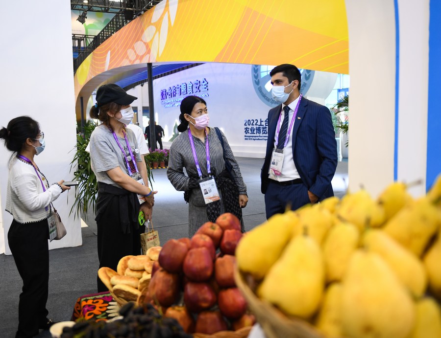 People visit a booth displaying fruits from Tajikistan at the 29th China Yangling Agricultural Hi-tech Fair in Yangling, northwest China's Shaanxi Province, Sept. 15, 2022. (Photo by Zou Jingyi/Xinhua)