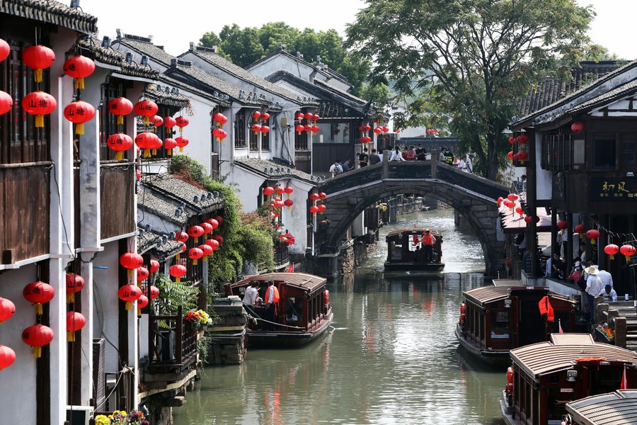 Tourists are seen at the Shantang Street scenic area in Suzhou, east China's Jiangsu Province, Oct. 1, 2022. (Photo by Hang Xingwei/Xinhua)