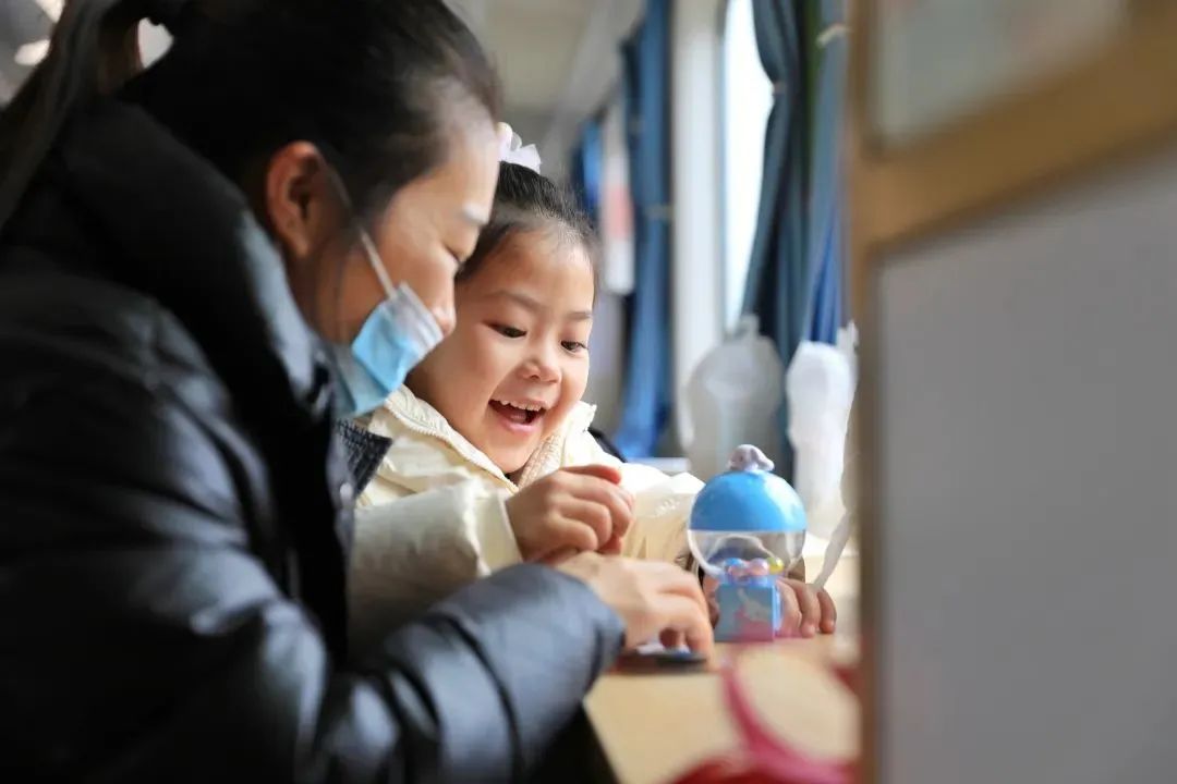 Wen Chenyi, 5 years old, reads ancient poetry and assembles toys with her mother on a train. [Photo/CCTV News]