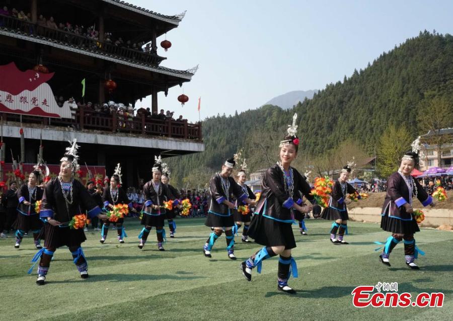 Villagers of Miao ethnic group dance with Lusheng, a reed-pipe wind instrument, to celebrate Er Yue Er (Dragon Head Raising Day) in Dongtou town, Rongshui Miao Autonomous County, south China's Guangxi Zhuang Autonomous Region, Feb. 20, 2023. (Photo: China News Service/Long Linzhi)