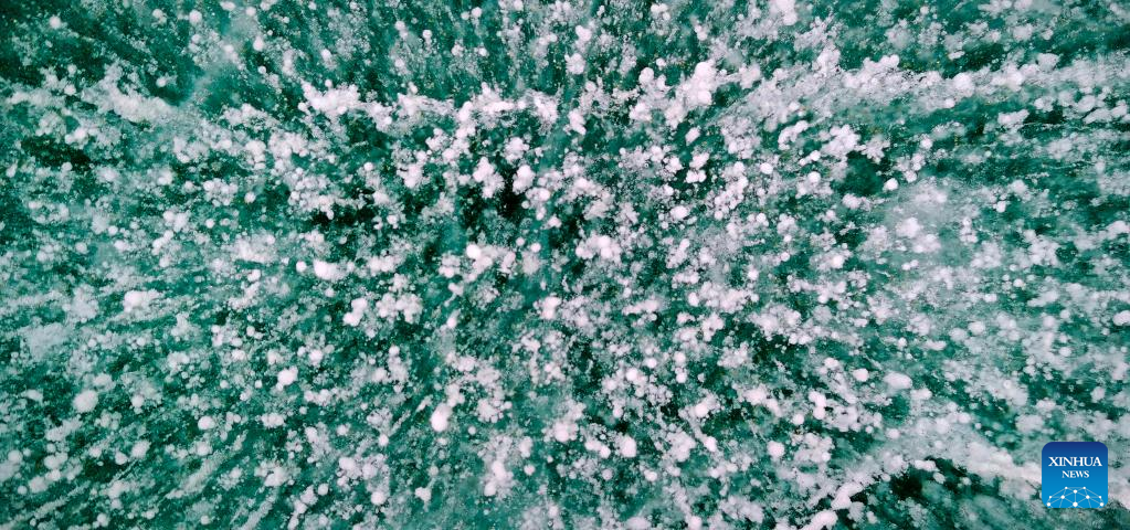 This photo taken with a mobile phone on Feb. 20, 2023 shows a view of an icy lake at the foot of Mount Qungmknag in Nyemo County of Lhasa, southwest China's Tibet Autonomous Region. (Xinhua/Shen Hongbing)