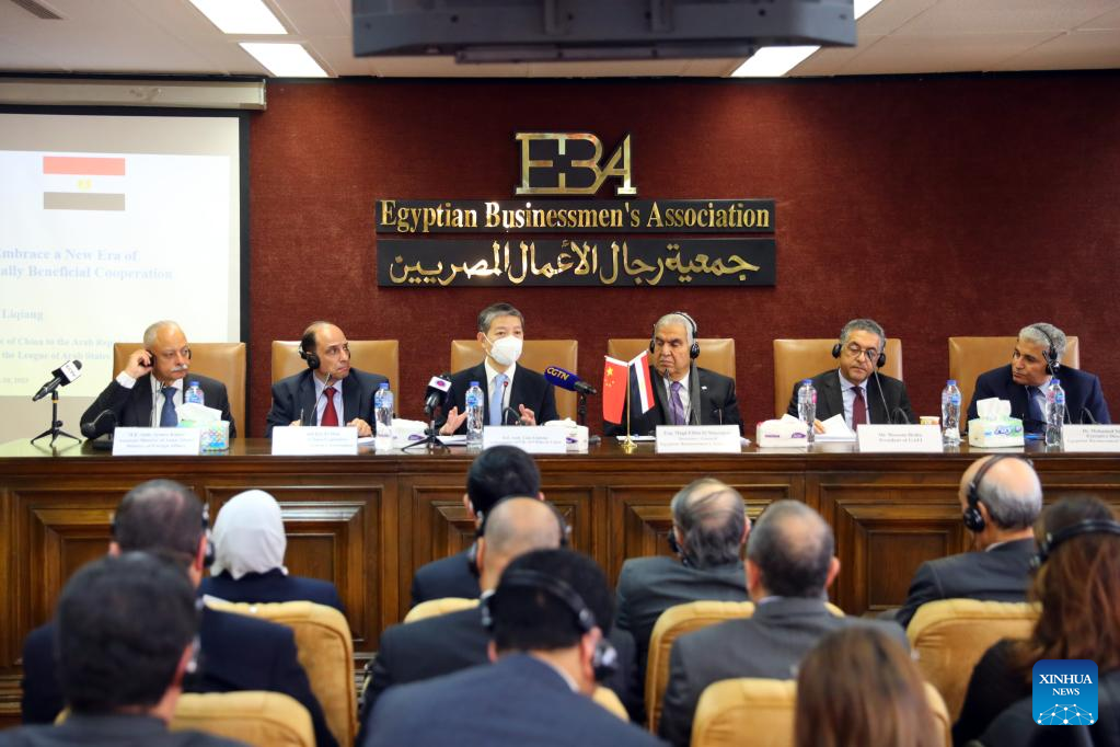 People attend the China-Egypt Entrepreneur Seminar hosted by the Egyptian Businessmen's Association in Cairo, Egypt, on Feb. 20, 2023. Egypt looks forward to attracting more investments from China through further improving the investment environment in the most populous Arab country, Egyptian officials and business leaders told a recent seminar held in Cairo. (Xinhua/Sui Xiankai)