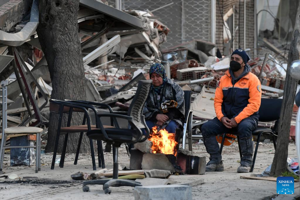 People sit by a fire near the rubble of a destroyed building in the quake-hit Hatay, Türkiye, on Feb. 21, 2023. At least six people were killed and 294 others injured in Monday's new earthquakes that struck Türkiye's southern province of Hatay, the disaster agency said Tuesday. The twin earthquakes, measuring 6.4- and 5.8-magnitude respectively, came two weeks after the massive ones rocked the same region on Feb. 6 that have killed more than 41,000. (Photo by Mustafa Kaya/Xinhua)