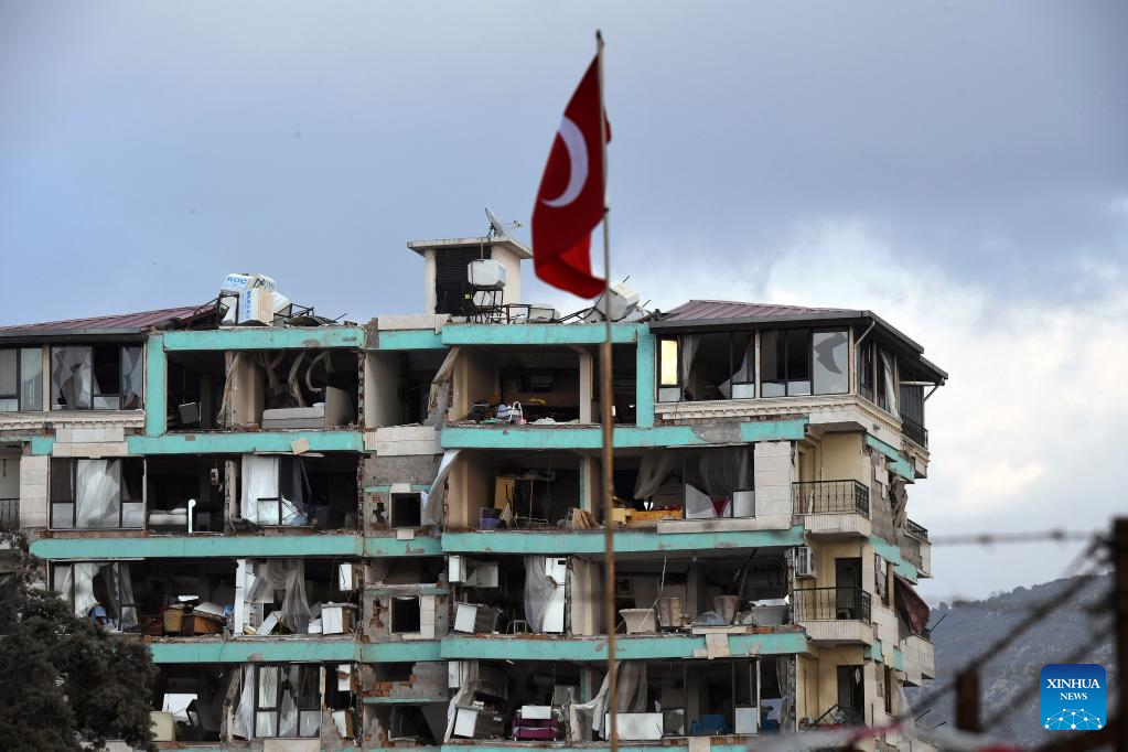 Photo taken on Feb. 21, 2023 shows a damaged building in the quake-hit Hatay, Türkiye. At least six people were killed and 294 others injured in Monday's new earthquakes that struck Türkiye's southern province of Hatay, the disaster agency said Tuesday. The twin earthquakes, measuring 6.4- and 5.8-magnitude respectively, came two weeks after the massive ones rocked the same region on Feb. 6 that have killed more than 41,000. (Photo by Mustafa Kaya/Xinhua)