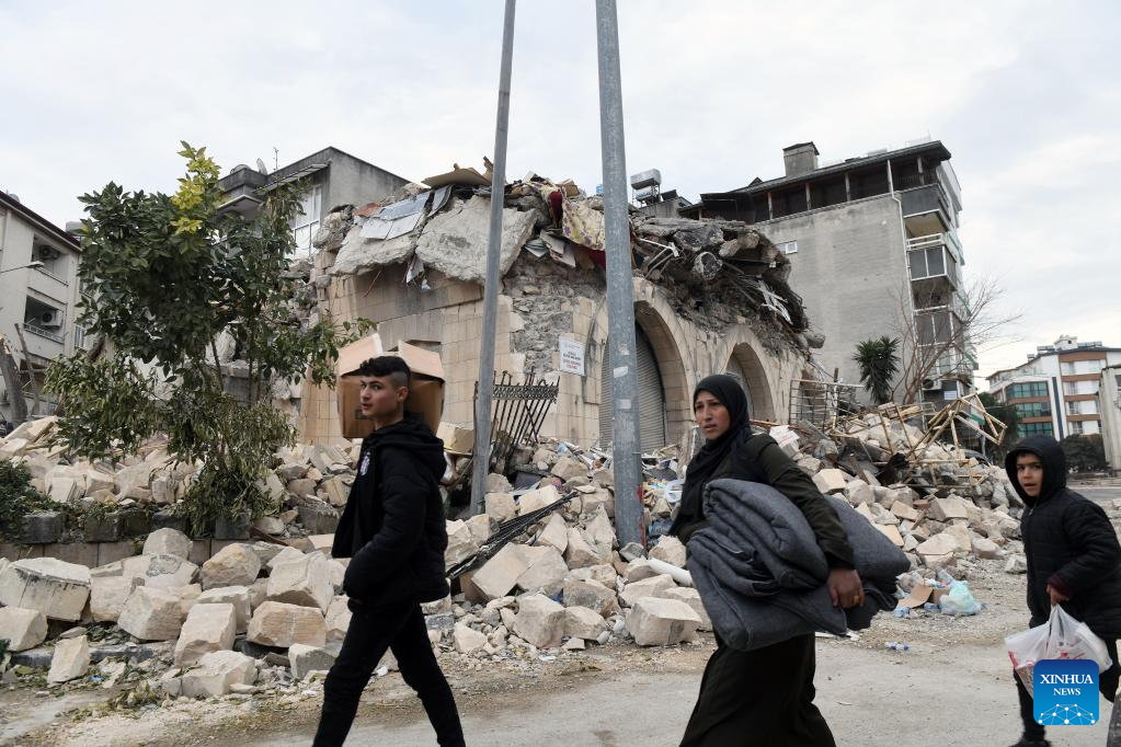 People walk past a destroyed building in the quake-hit Hatay, Türkiye, on Feb. 21, 2023. At least six people were killed and 294 others injured in Monday's new earthquakes that struck Türkiye's southern province of Hatay, the disaster agency said Tuesday. The twin earthquakes, measuring 6.4- and 5.8-magnitude respectively, came two weeks after the massive ones rocked the same region on Feb. 6 that have killed more than 41,000. (Photo by Mustafa Kaya/Xinhua)