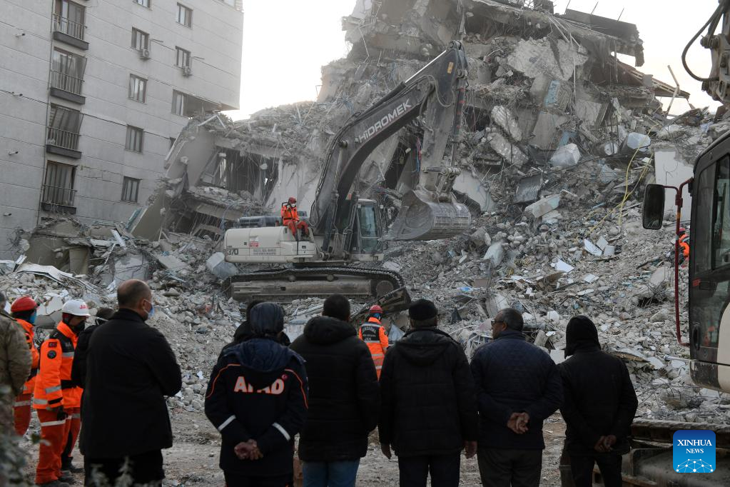An excavator clears debris in the quake-hit Hatay, Türkiye, on Feb. 21, 2023. At least six people were killed and 294 others injured in Monday's new earthquakes that struck Türkiye's southern province of Hatay, the disaster agency said Tuesday. The twin earthquakes, measuring 6.4- and 5.8-magnitude respectively, came two weeks after the massive ones rocked the same region on Feb. 6 that have killed more than 41,000. (Photo by Mustafa Kaya/Xinhua)