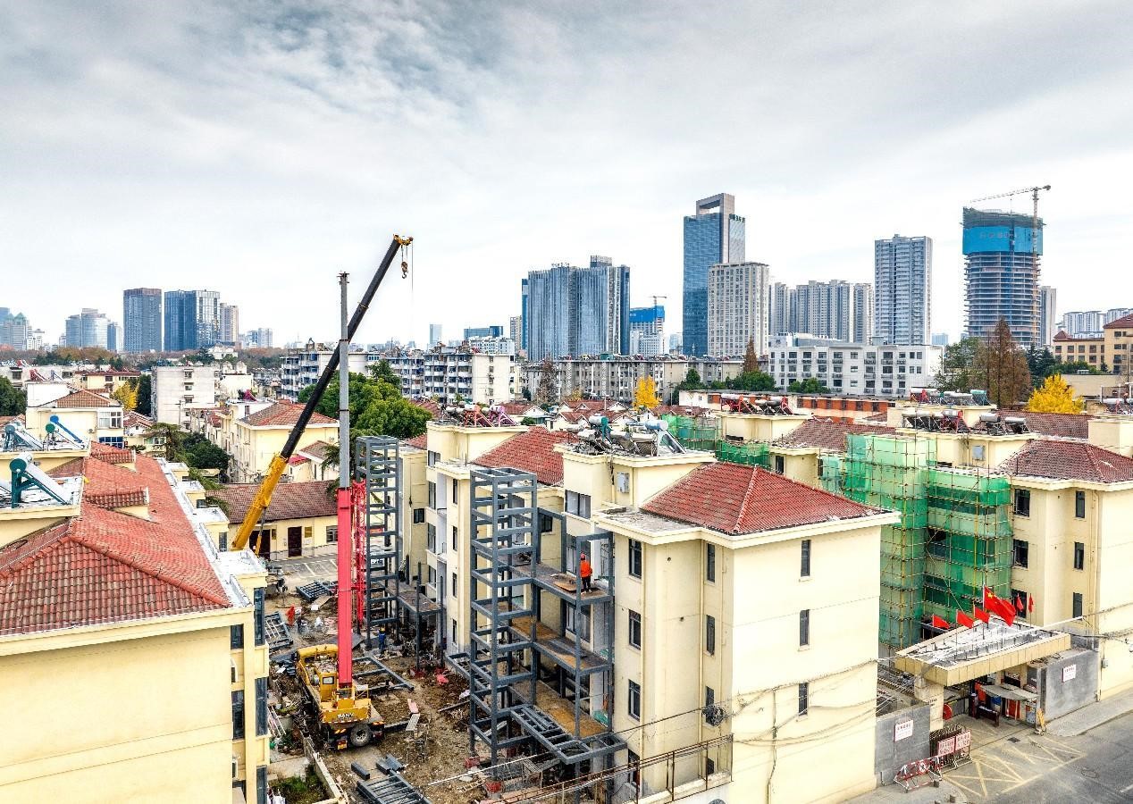 Elevators are installed for an old residential community in Hefei, capital of east China's Anhui province, Dec. 11, 2022. (People's Daily Online/Luo Xianyang)