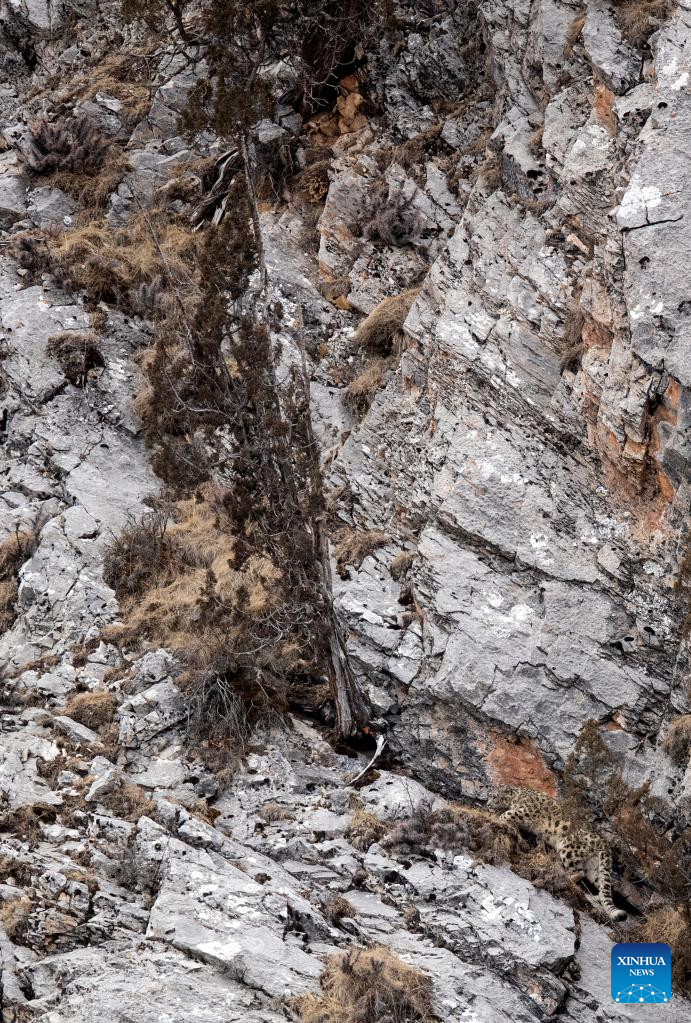A snow leopard is pictured in a canyon in Zadoi County of Yushu Tibetan Autonomous Prefecture, northwest China's Qinghai Province, Feb. 21, 2023. (Xinhua/Fei Maohua)
