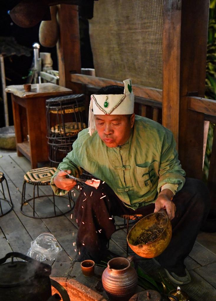 Villager Nan Kang bakes tea around the fireplace in Mangjing Village of Lancang Lahu Autonomous County in Pu'er City, southwest China's Yunnan Province, Feb. 9, 2023. (Xinhua/Ban Wei)