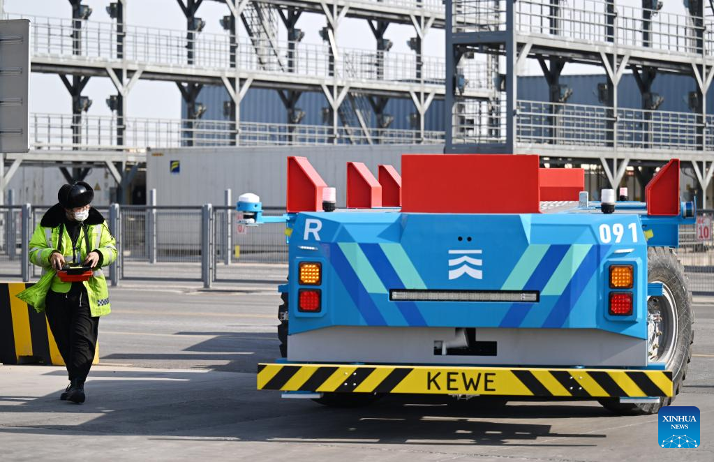 A staff member operates a smart delivery robot at the full Internet of Things container terminal of Tianjin Port in north China's Tianjin, Feb. 21, 2023.
