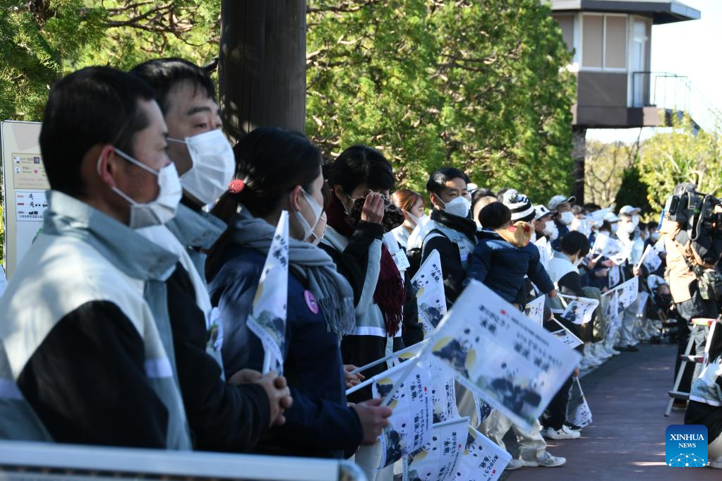 Staff members line up to bid farewell to giant pandas Eimei, Ouhin and Touhin at Adventure World in Shirahama, Wakayama prefecture, Japan, Feb. 22, 2023.