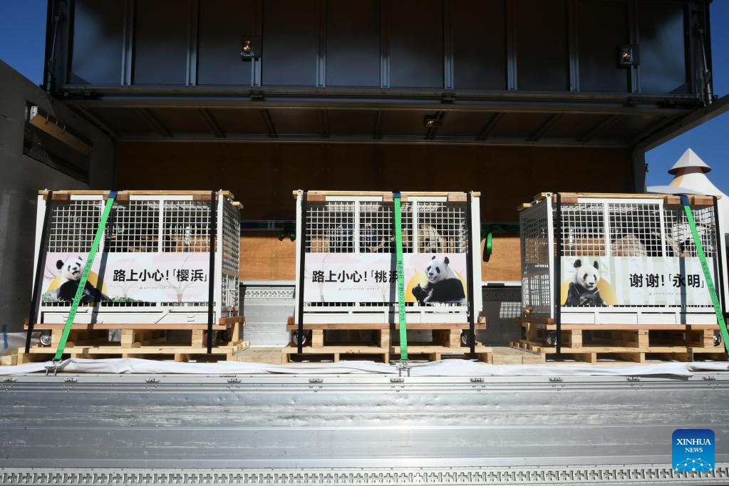 Giant pandas Ouhin, Touhin and Eimei (L-R) are about to set off for China at Adventure World in Shirahama, Wakayama prefecture, Japan, Feb. 22, 2023.