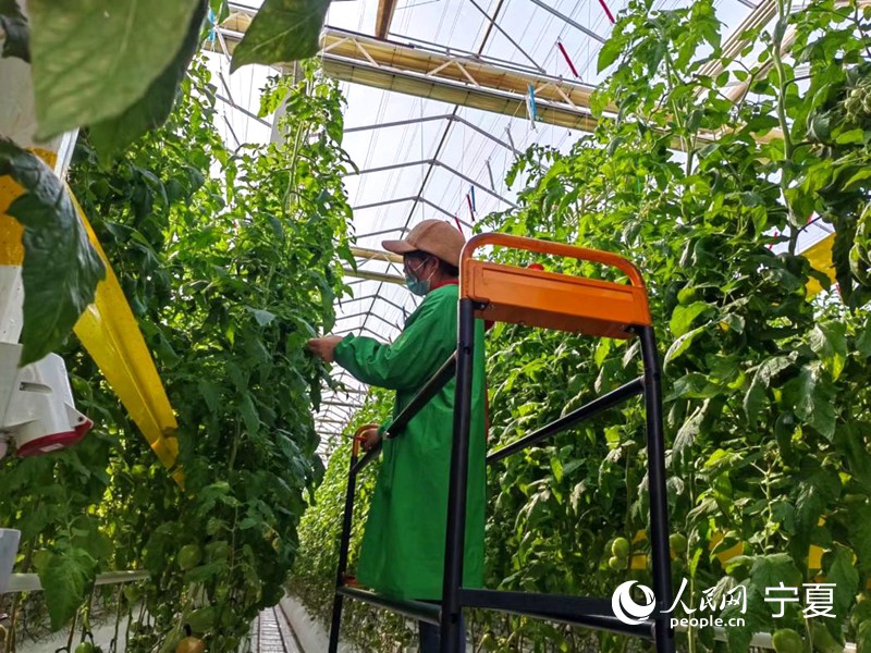 A worker prunes branches and leaves at an intelligent agriculture industrial park in Minning township, Yinchuan, northwest China’s Ningxia Hui Autonomous Region. (Photo/Li Tiantian)