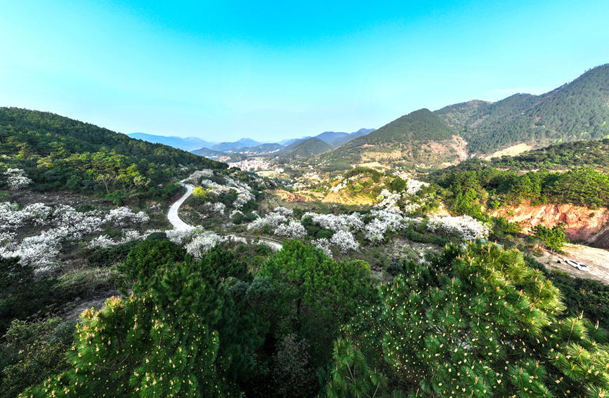Aerial photo shows a valley blanketed by pear flowers in Bancheng township, Qinbei district, Qinzhou, south China's Guangxi Zhuang Autonomous Region. (Photo/Lu Min)