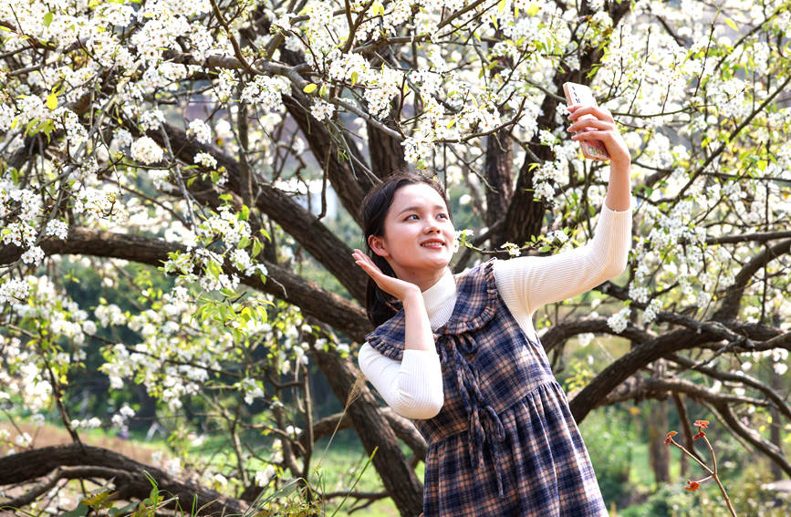 A visitor poses for pictures with pear flowers in Bancheng township, Qinbei district, Qinzhou, south China's Guangxi Zhuang Autonomous Region. (Photo/Lu Min)