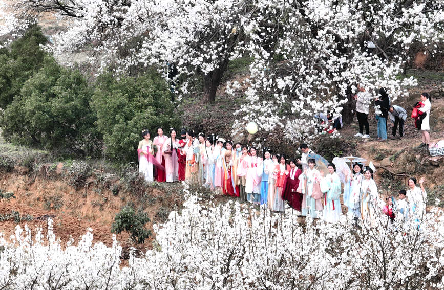 Visitors pose for pictures with pear flowers in Bancheng township, Qinbei district, Qinzhou, south China's Guangxi Zhuang Autonomous Region. (Photo/Zhang Xiaodong)