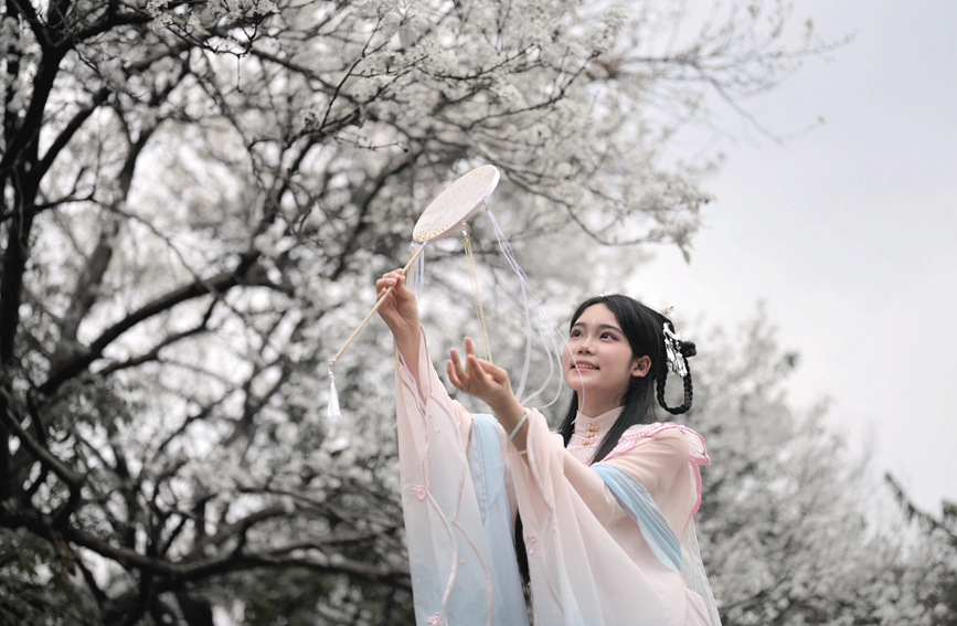 A visitor poses for pictures with pear flowers in Bancheng township, Qinbei district, Qinzhou, south China's Guangxi Zhuang Autonomous Region. (Photo/Zhang Xiaodong)