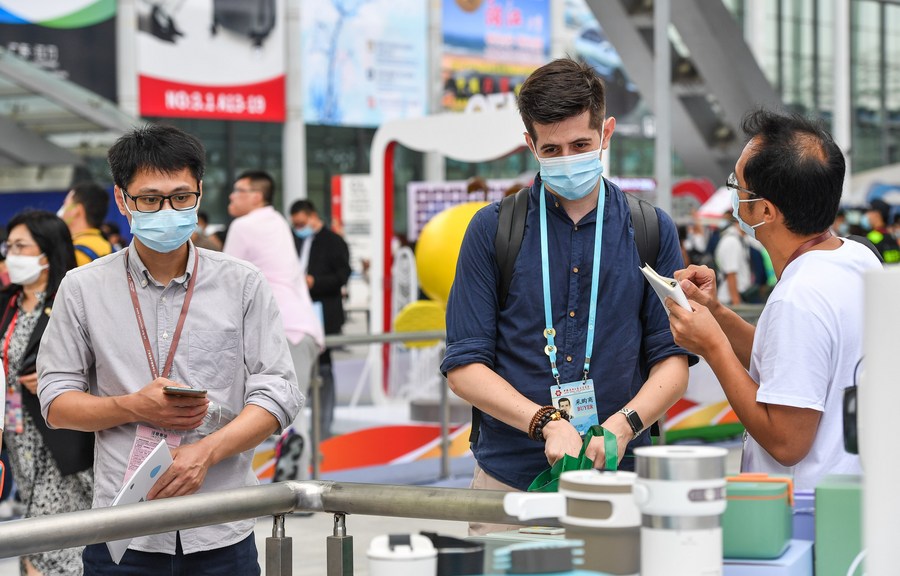 Spanish buyer Daniel Javier Salvador (C) talks with an exhibitor at the booth of a home appliances producer during the 130th session of the China Import and Export Fair, or the Canton Fair, in Guangzhou, south China's Guangdong Province, Oct. 15, 2021. (Xinhua/Liu Dawei)