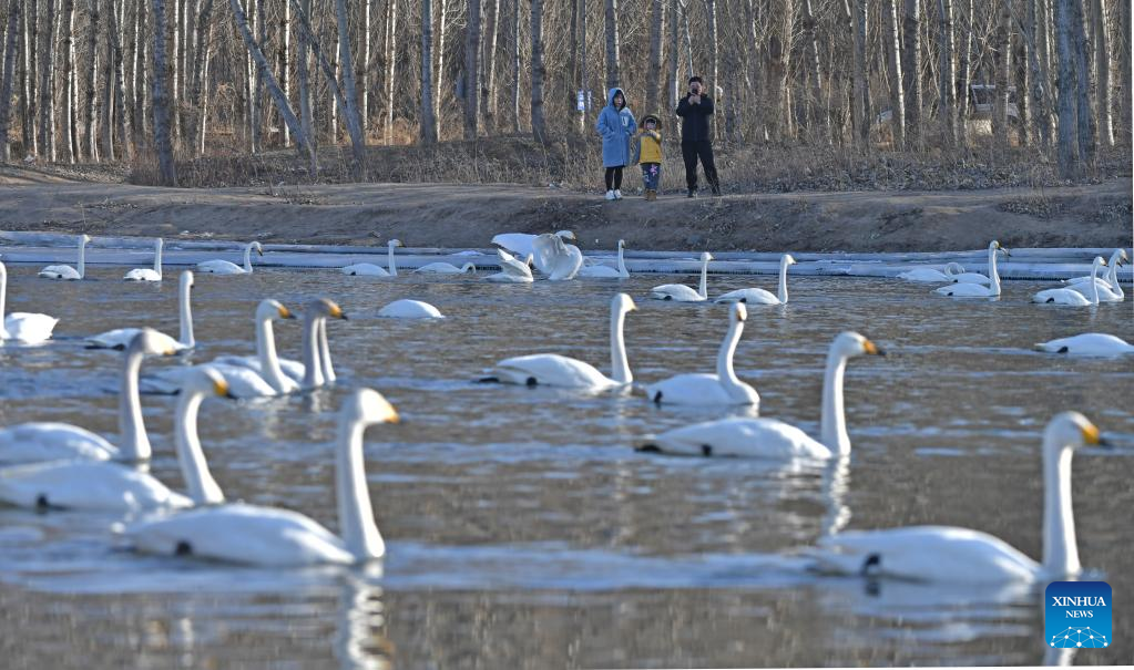 Visitors watch swans in Hongcun Village, Bajiazi Township, Beipiao of northeast China's Liaoning Province, Feb. 21, 2023.