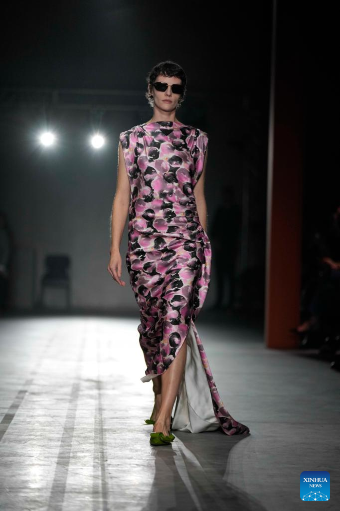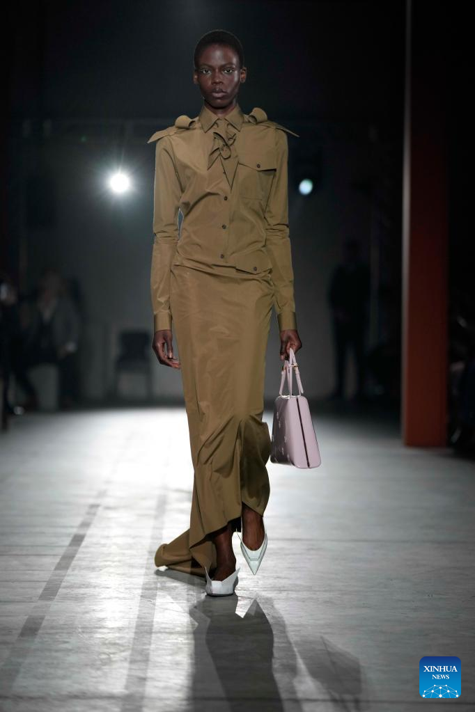 A model presents a creation from Prada women's Fall/Winter 2023/2024 collection during Milan Fashion Week in Milan, Italy, on Feb. 23, 2023. (Str/Xinhua)