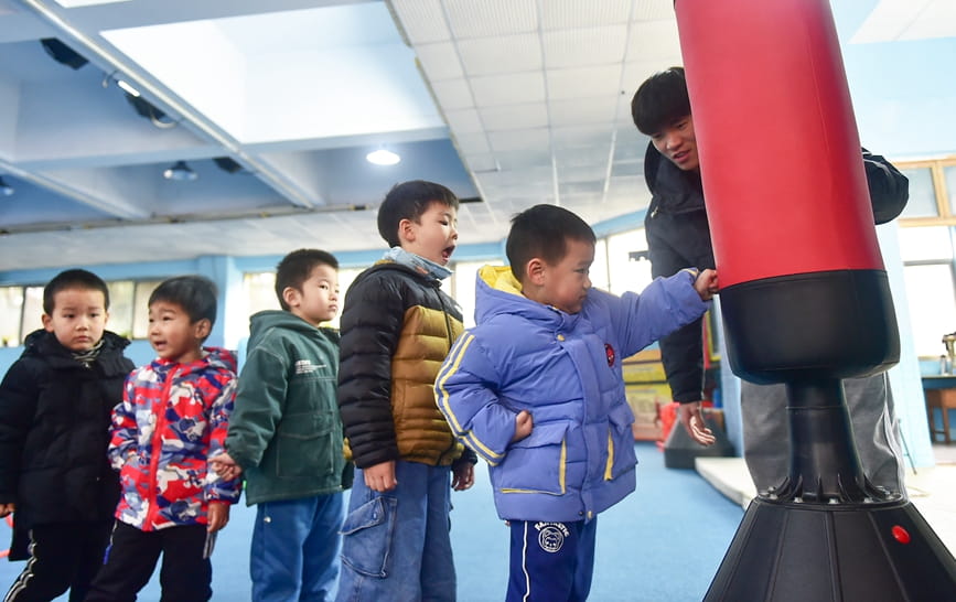 Children learn Taekwondo under the instruction of a teacher at Luoyang Youth Children’s Activity Center, in Luoyang city, north China’s Henan Province. (People’s Daily Online/Huang Zhengwei)