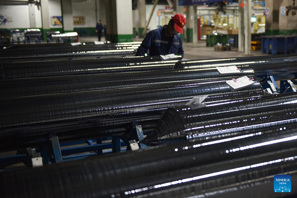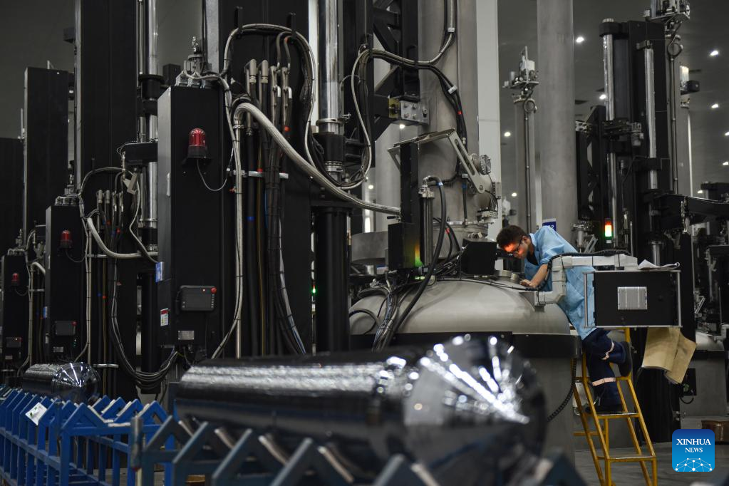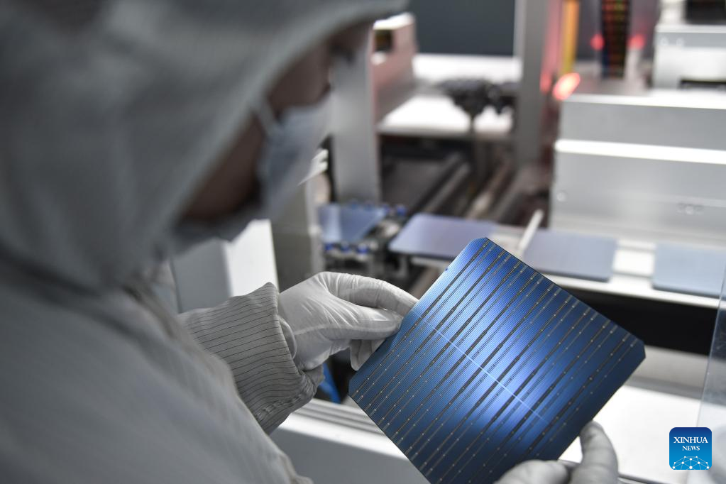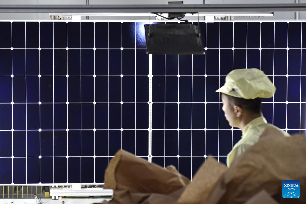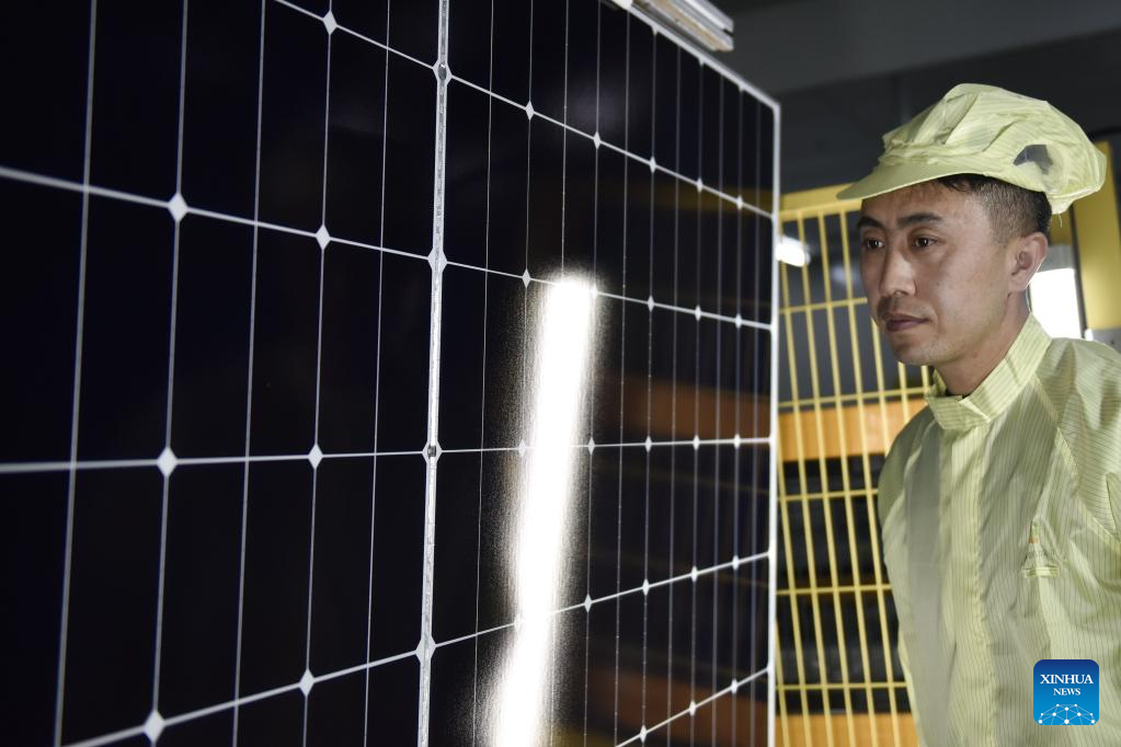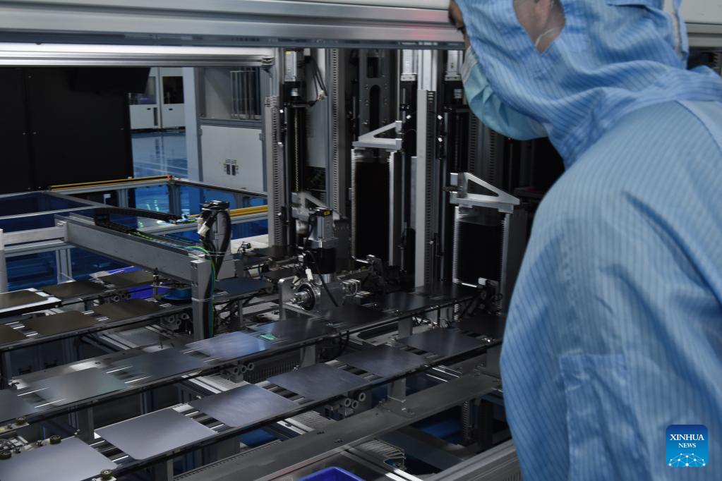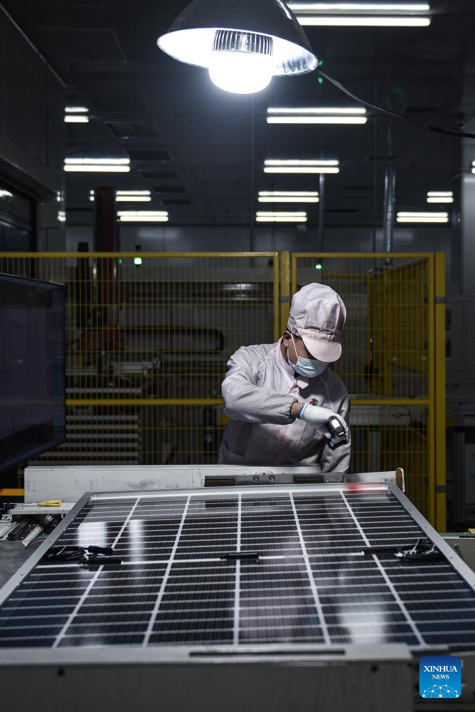 A worker works at a workshop of a photovoltaic modules manufacturer in Xining, northwest China's Qinghai Province, Feb. 22, 2023. Qinghai is an important clean energy production base in China. In recent years, the photovoltaic industry has developed rapidly in Xining City, and photovoltaic related products are in high demand. (Xinhua/Wu Gang)