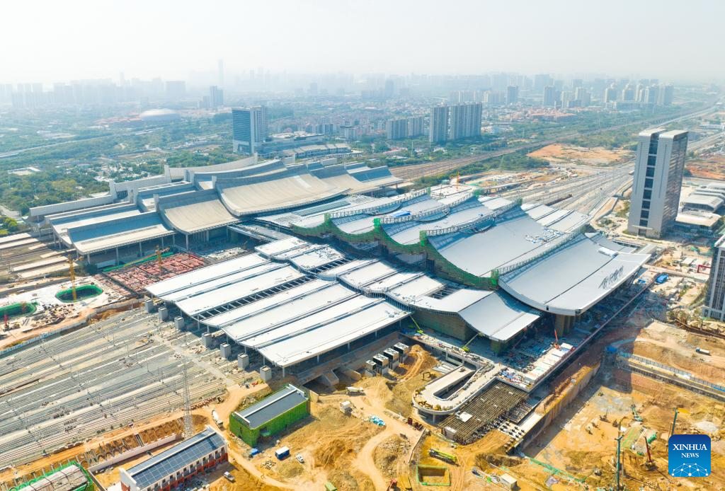 This aerial photo taken on Feb. 21, 2023 shows the Fuzhou South Railway Station under construction in Fuzhou, southeast China's Fujian Province. The 277-km railway runs along southeast China's coastline and crosses over three major bays on gigantic bridges. It's the country's first sea-crossing high-speed railway. With a designed speed of 350 km per hour and eight stations along the route, it is expected to slash the travel time between the two cities to just one hour. (Xinhua/Lin Shanchuan)