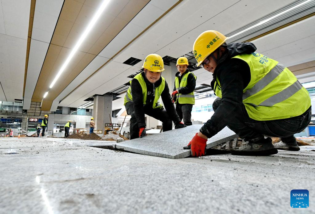 Constructors lay floor tiles at Fuzhou South Railway Station in Fuzhou, southeast China's Fujian Province, Feb. 21, 2023. The 277-km railway runs along southeast China's coastline and crosses over three major bays on gigantic bridges. It's the country's first sea-crossing high-speed railway. With a designed speed of 350 km per hour and eight stations along the route, it is expected to slash the travel time between the two cities to just one hour. (Xinhua/Lin Shanchuan)