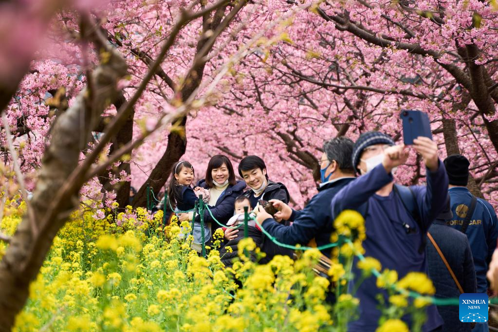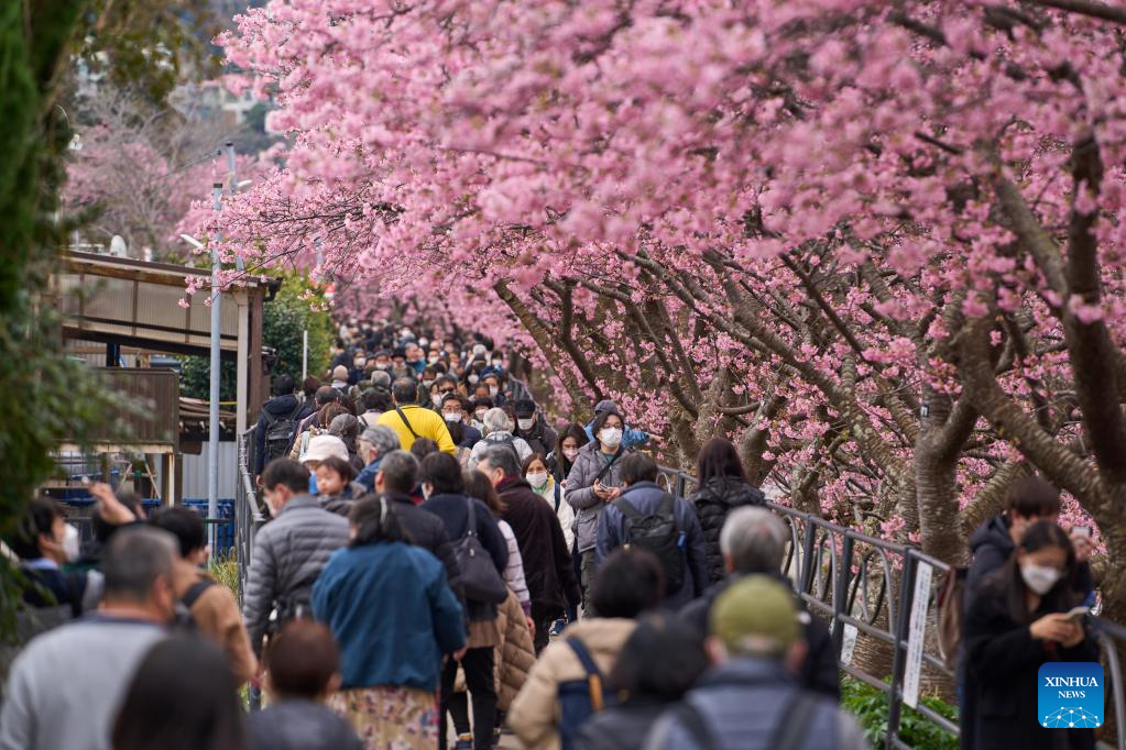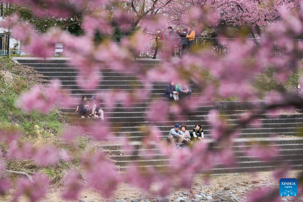 People enjoy early-blooming Kawazu cherry blossoms in Kawazu of Shizuoka Prefecture, Japan, Feb. 24, 2023. (Xinhua/Zhang Xiaoyu)
