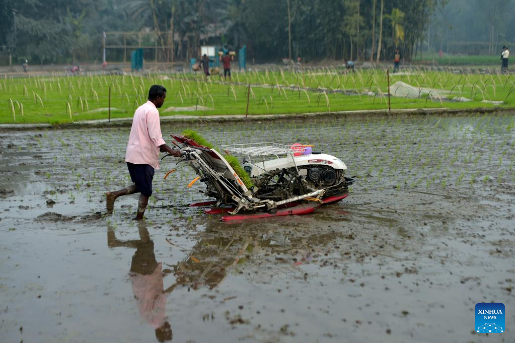 A farmer uses a machine to plant rice seedlings in a field in Nilphamari, Bangladesh, Feb. 9, 2023. (Xinhua)