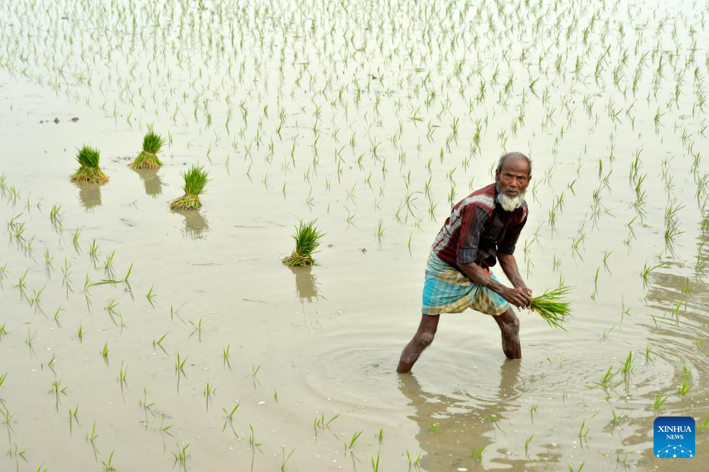 A farmer plants rice seedlings in a field in Nilphamari, Bangladesh, Feb. 9, 2023. (Xinhua)