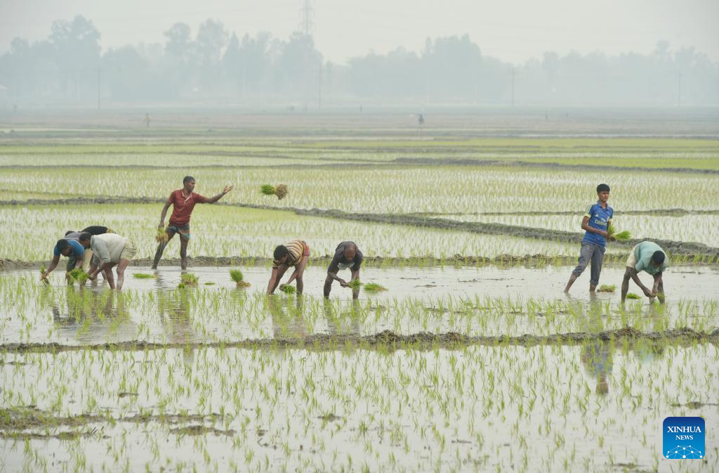 Farmers plant rice seedlings in a field in Nilphamari, Bangladesh, Feb. 9, 2023. (Xinhua)