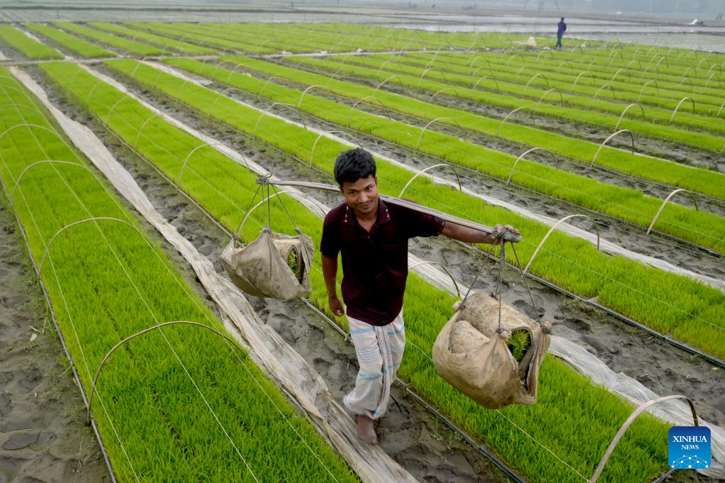 A farmer transports rice seedlings in a field in Nilphamari, Bangladesh, Feb. 9, 2023. (Xinhua)