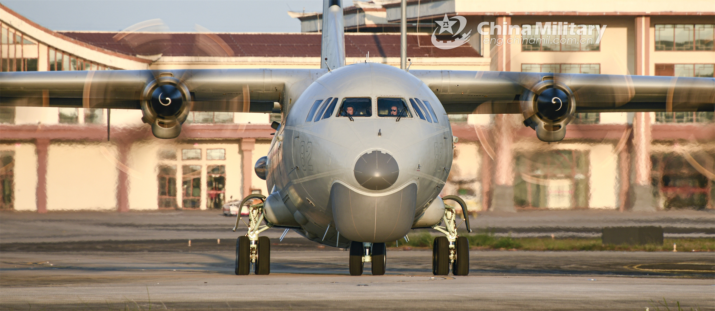 An anti-submarine patrol aircraft attached to a naval aviation regiment under the PLA Southern Theater Command gets ready for takeoff during a recent training exercise, which aims to hone the skills and combat capabilities of the troops. (eng.chinamil.com.cn/Photo by Qin Qianjiang)
