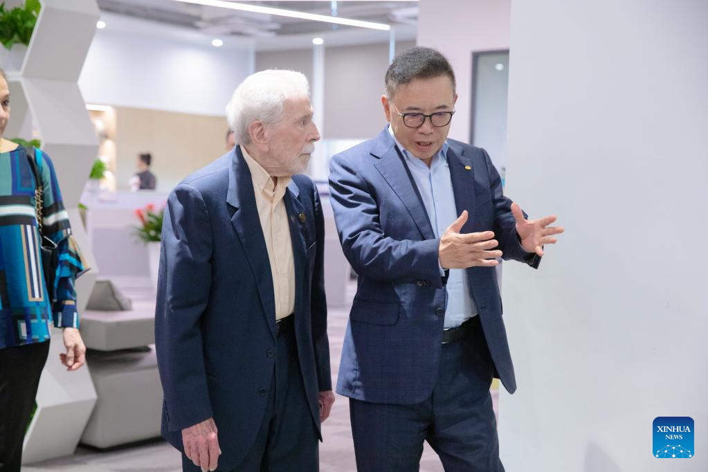 This undated photo shows 94-year-old Brazilian businessman Affonso Brando Hennel (L), who is founder of time-honored Brazilian home appliance manufacturer SEMP, talking with Li Dongsheng, chairman of China's electronics giant TCL Group, in Shenzhen, south China's Guangdong Province. (Xinhua)