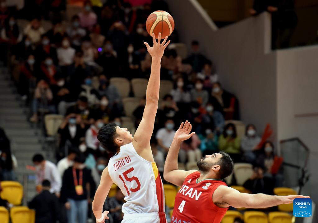 Zhou Peng of China shoots during the Group F match between China and Iran of FIBA Basketball World Cup Asian Qualifiers in Hong Kong, south China, Feb. 26, 2023. (Xinhua/Lo Ping Fai)