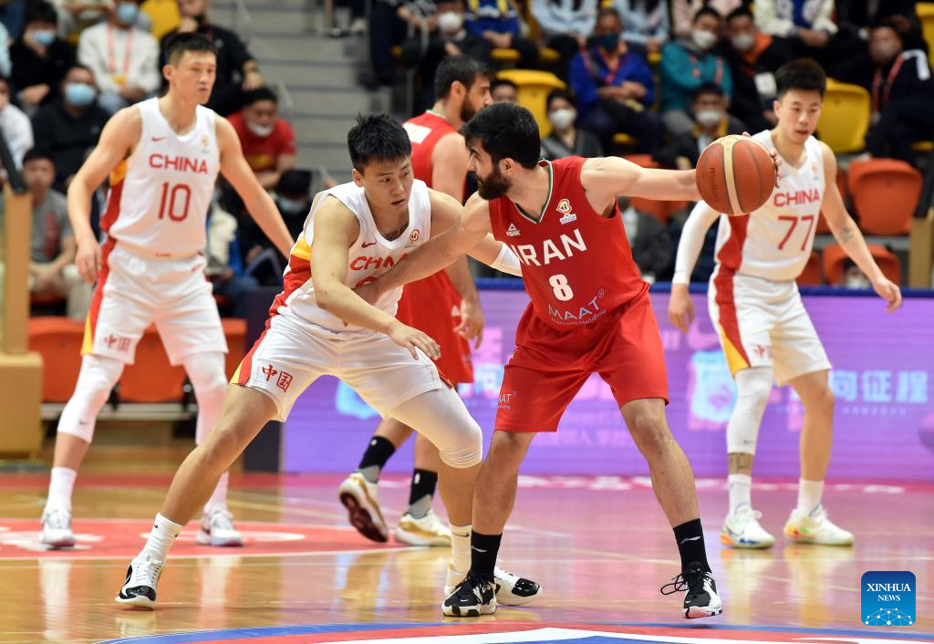 Cui Yongxi (1st L) of China breaks through during the Group F match between China and Iran of FIBA Basketball World Cup Asian Qualifiers in Hong Kong, south China, Feb. 26, 2023. (Xinhua/Lo Ping Fai)