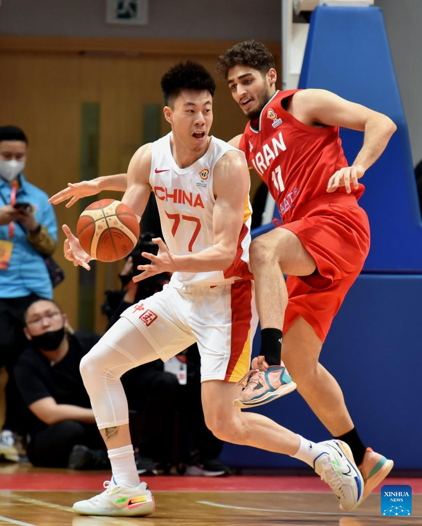 Zhang Zhenlin (L) of China competes during the Group F match between China and Iran of FIBA Basketball World Cup Asian Qualifiers in Hong Kong, south China, Feb. 26, 2023. (Xinhua/Lo Ping Fai)