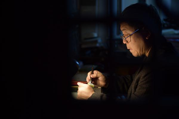 Su Donghe carves a seal with a knife. (Photo/CCTV News)
