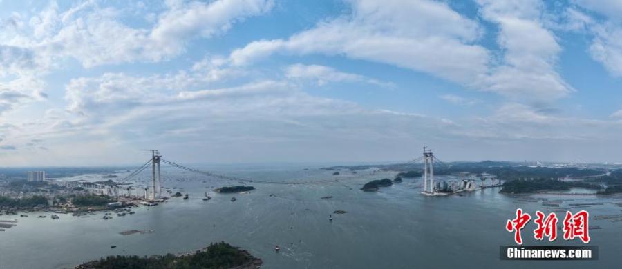 Aerial view shows the Longmen Bridge is under construction in Qinzhou, south China's Guangxi Zhuang Autonomous Region, Feb. 24, 2023. (Photo: China News Service/Wang Ronghua)