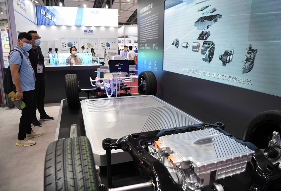 Visitors look at a blade-shaped battery produced by China's leading new energy vehicle (NEV) manufacturer BYD during the 130th session of the China Import and Export Fair, also known as the Canton Fair in Guangzhou, south China's Guangdong Province, Oct. 15, 2021. (Xinhua/Deng Hua)