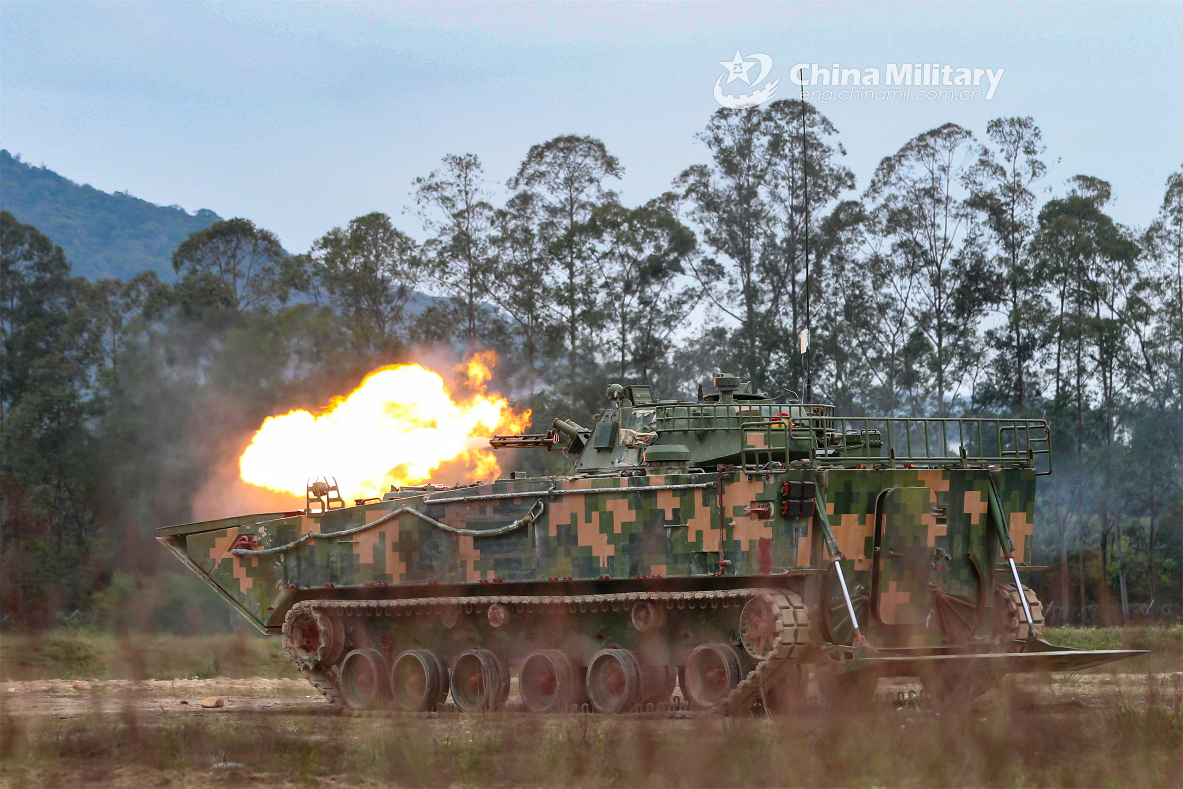 An amphibious infantry fighting vehicle attached to the PLA 74th Group Army spits fire at simulated target during a recent live-fire training exercise. (eng.chinamil.com.cn/Photo by Li Bin)